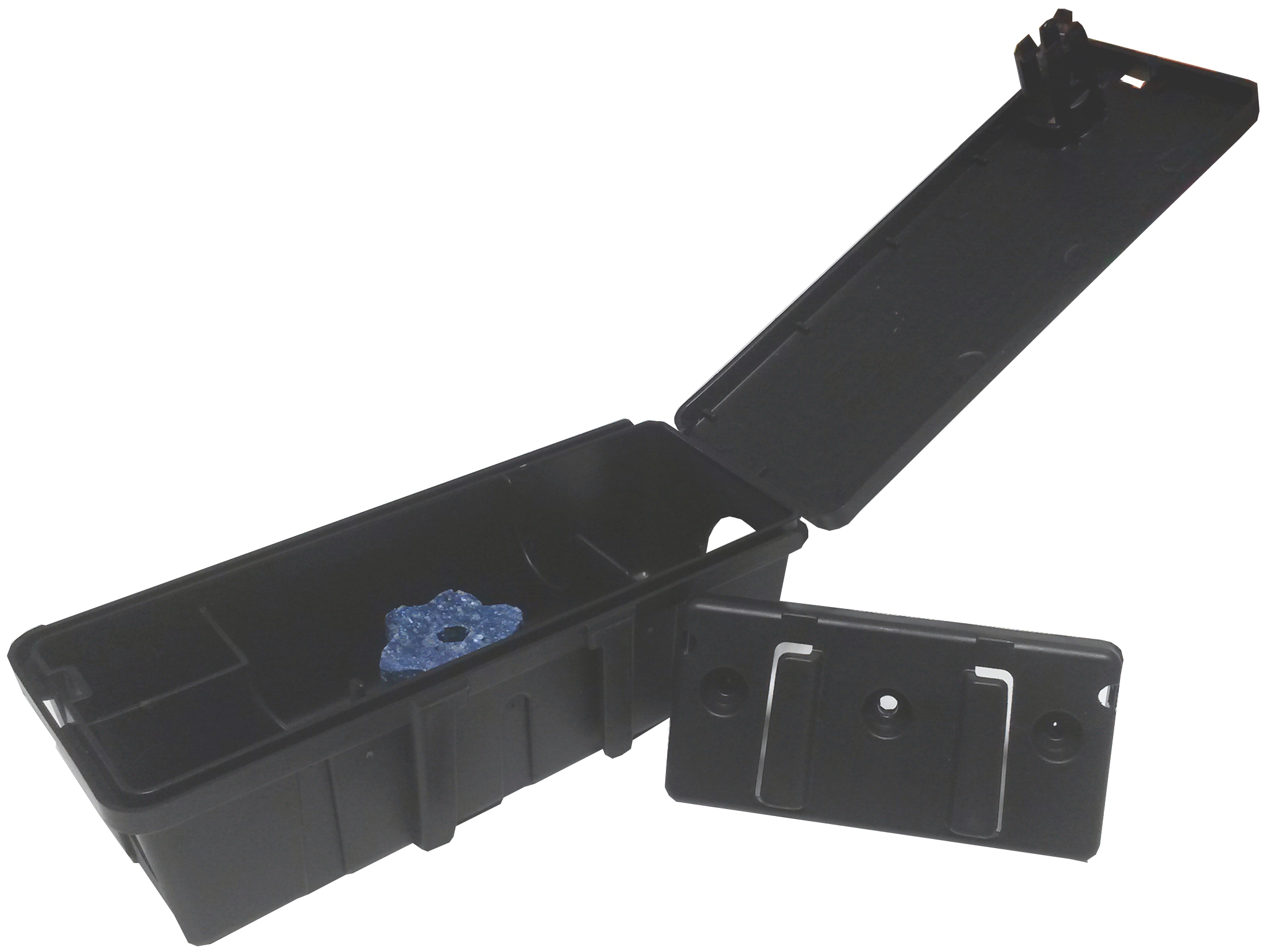Rodenticide blocks can be secured vertically with the lid opening laterally for easier servicing.